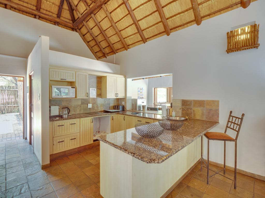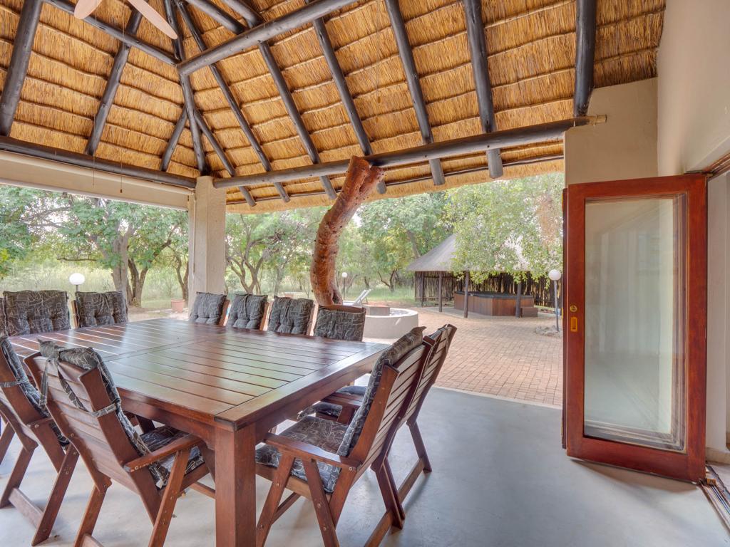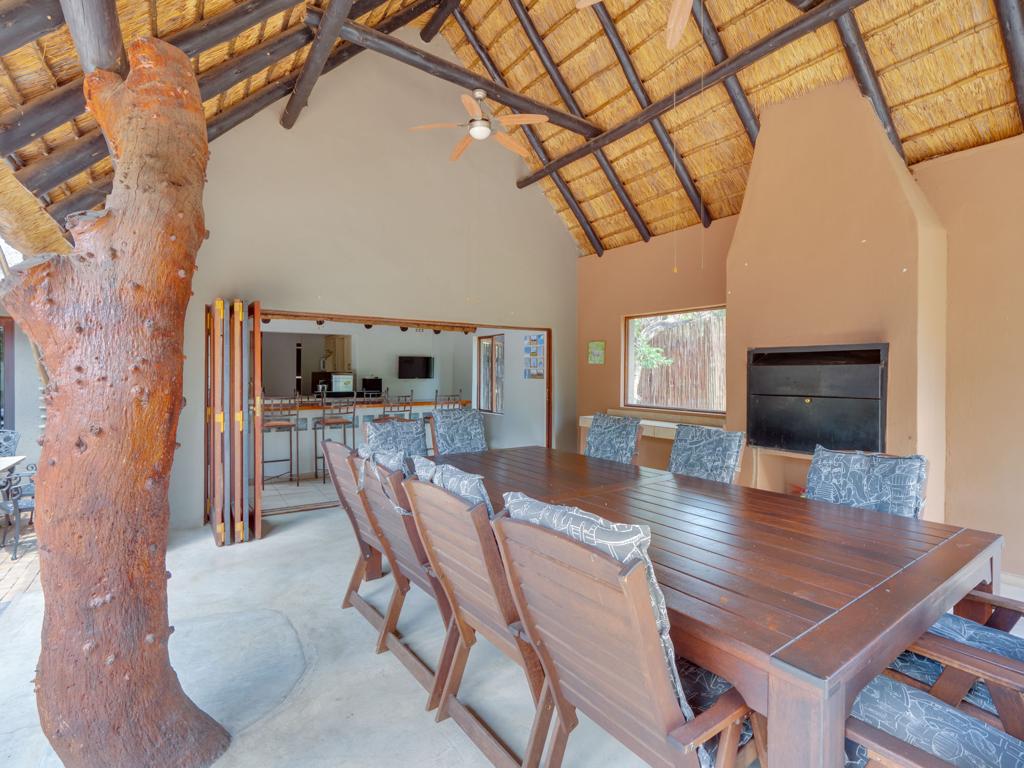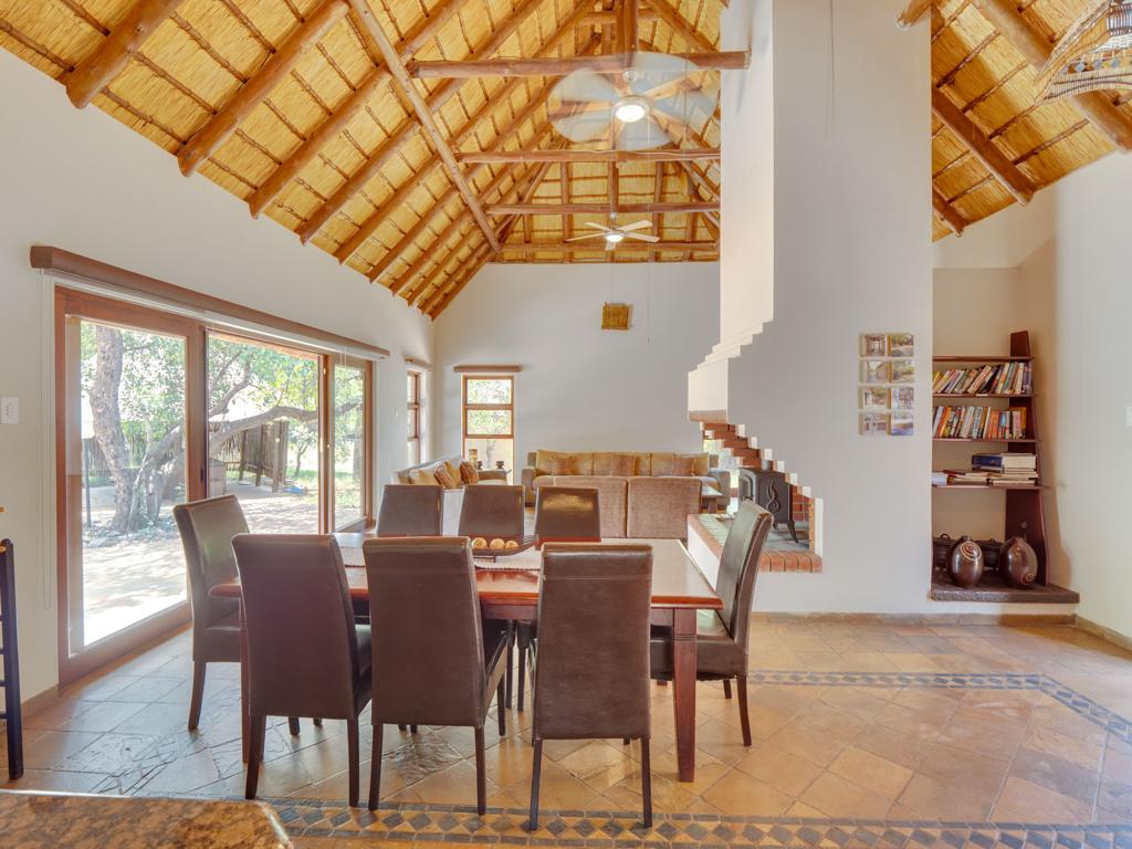 The heart of the home includes a large, well-equipped kitchen, an expansive dining area, and a welcoming lounge – perfect for long conversations, shared meals, and restful evenings after a day exploring the bushveld.