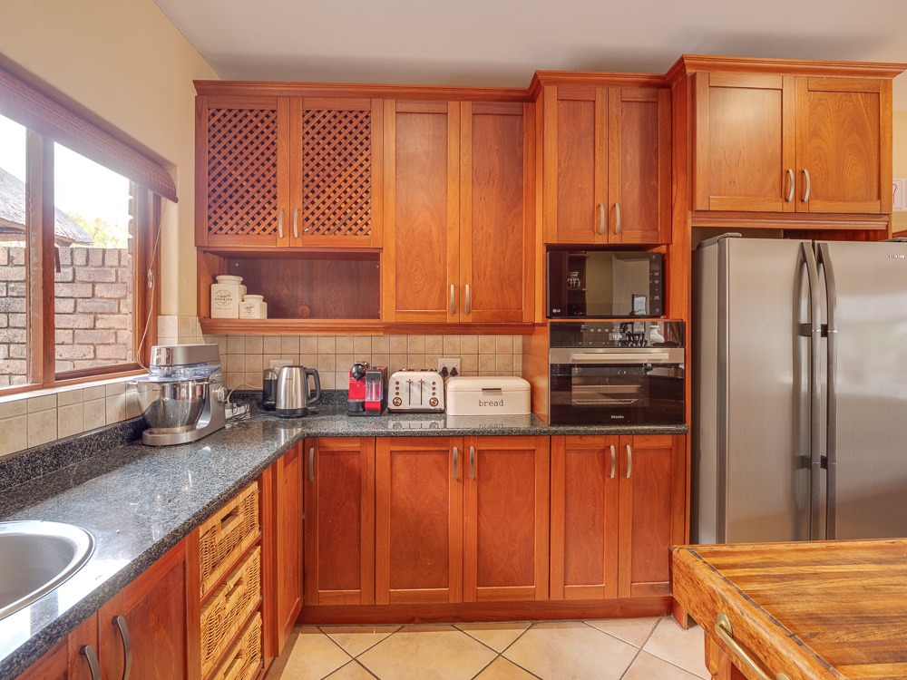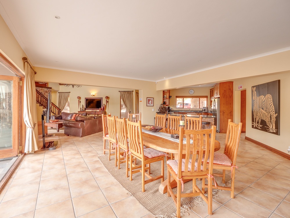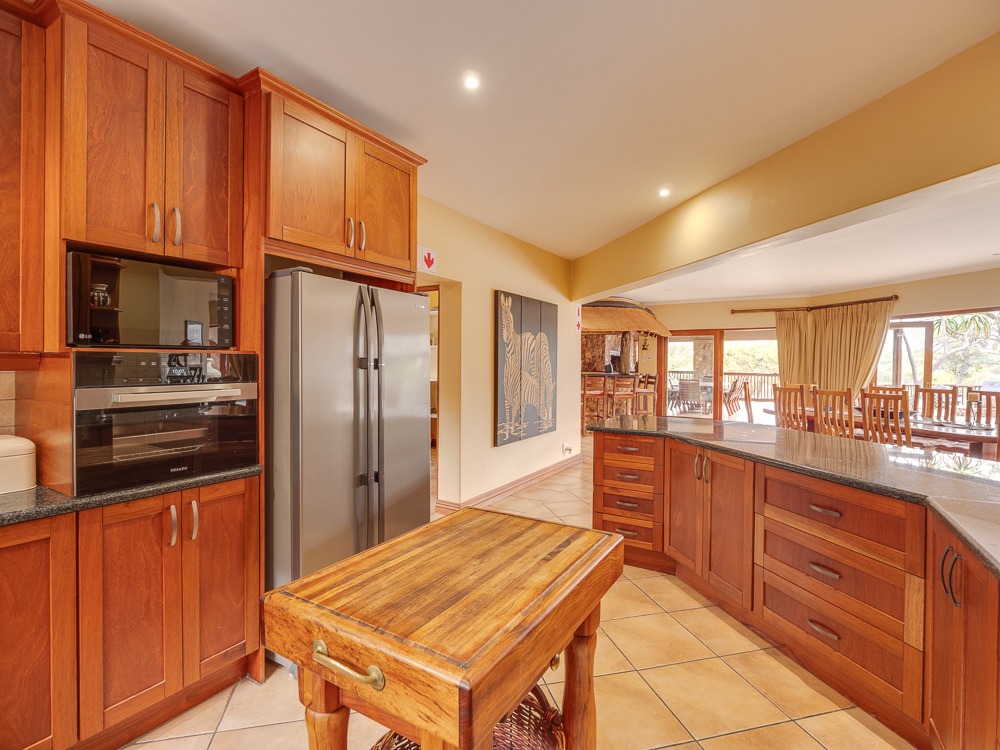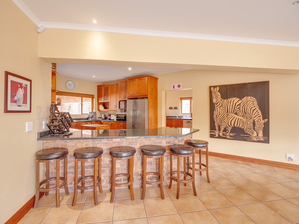 The heart of the home features a sleek open-plan layout with high-end Miele appliances, flowing seamlessly into a spacious dining area, designer bar, and comfortable lounge. Large glass doors open onto a covered terrace overlooking the bushveld — the perfect setting for morning coffee as antelope wander past or sundowners as the sun sets over the horizon.